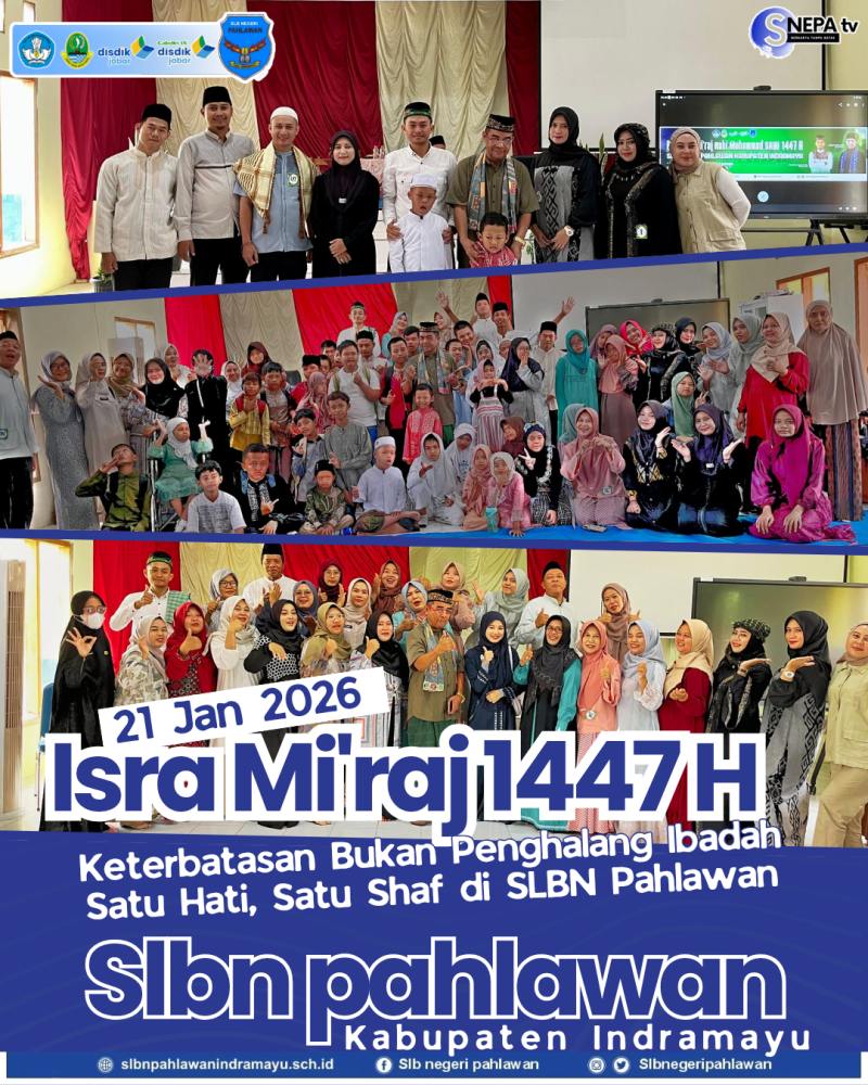 INDRAMAYU – Keluarga besar SLB Negeri Pahlawan Kabupaten Indramayu menyelenggarakan peringatan Isra Mi’raj Nabi Muhammad SAW 1447 H./2026 dengan khidmat dan meriah pada hari ini. Kegiatan yang berlangsung di lingkungan sekolah ini menjadi momentum bagi seluruh warga sekolah untuk mempertebal iman sekaligus menampilkan bakat para siswa.